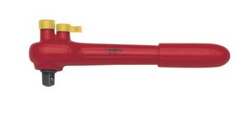 镀铬,双层安全绝缘 通过头部按钮锁住套筒 可正反转操作,可在1000V以下电压下作业 用于装插各种3/8“ 和 1/2“套筒